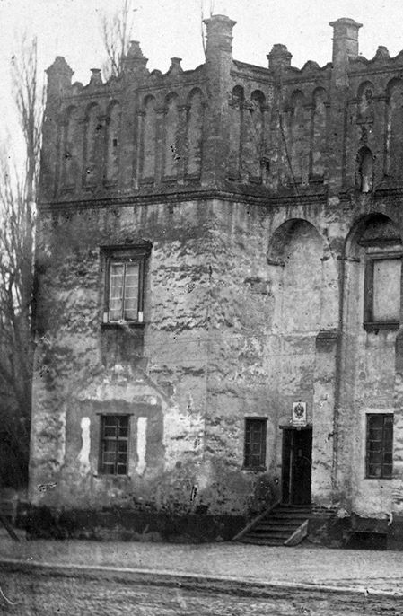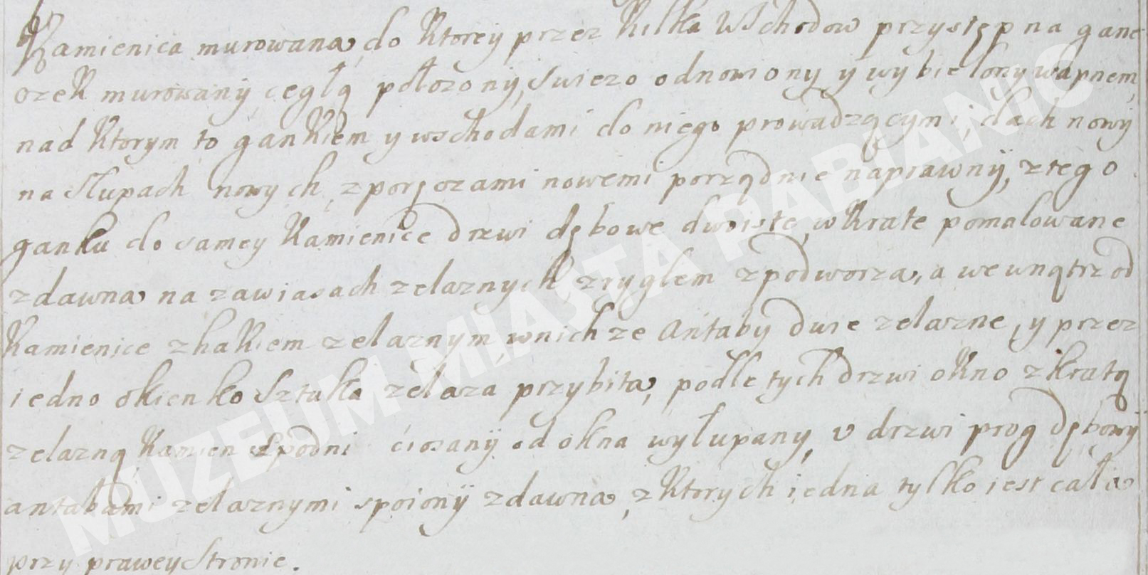 „Kamienica murowana do ktorey przez Wrota wschodnie przystęp na ganek przed murowany cegłą położony, wiezo odnowiony y wybielony wapnem, nad ktorym to gankiem y schodami do niego prowadzącymi, dach nowy na słupach nowych z poręczami nowemi, porządnie naprawiony, z tego ganku do samey Kamienice drzwi dębowe dwoiste w krate pomalowane z dawną na zawiasach żelaznych z ryglem z podwórza, a wewnątrz do Kamienice z hakiem żelaznym u nichże antaby duże żelazne y przez iedno okienko szklane żelaza przybito, podle tych drzwi okno z kratą żelazną, kamień spodni ciosany do okna wystawny, u drzwi progi dębowe, antabami żelaznemi spojony z dawna, z ktorych iedna tylko iest cała przy prawej stronie. (…)„