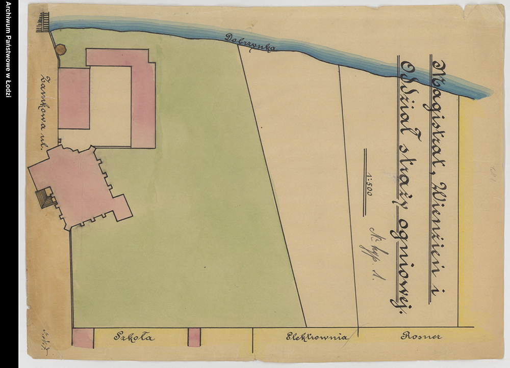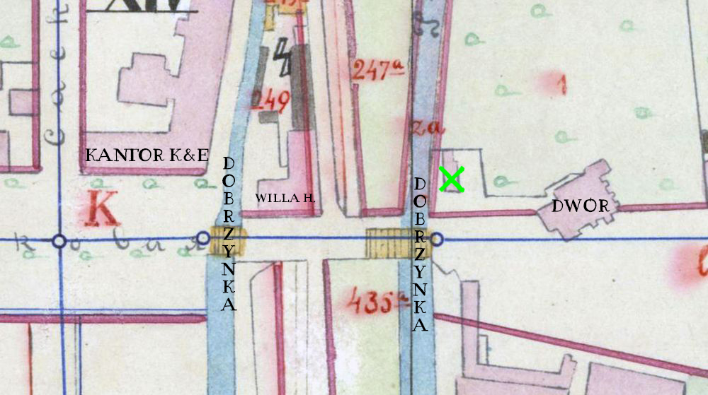 A jednak nie. Patrząc od lewej strony, mamy kantor, potem jeszcze niezasypane drugie koryto rzeki, willę, uliczkę dojazdową do hal fabrycznych, którą kojarzymy do dziś jako przedłużenie Lipowej, potem znów koryto rzeki i dopiero pojawia się ów budynek. Z wyglądu pasuje na mieszkalny, ale na tym właściwie kończy się cała nasza wiedza o nim. Stał tam jeszcze do czasu wykonania zdjęcia oczywiście 😉 ale na planie Starzyńskiego z 1908 już go nie ma. Ba! Już stoją tam dwa nowe budynki, czyli pierwsza lokalizacja garaży Straży Ogniowej oraz areszt miejski za strażą.
