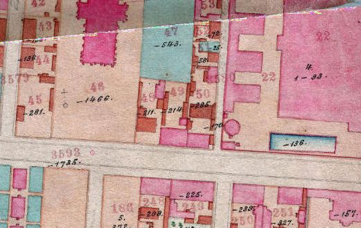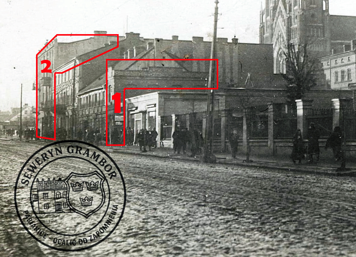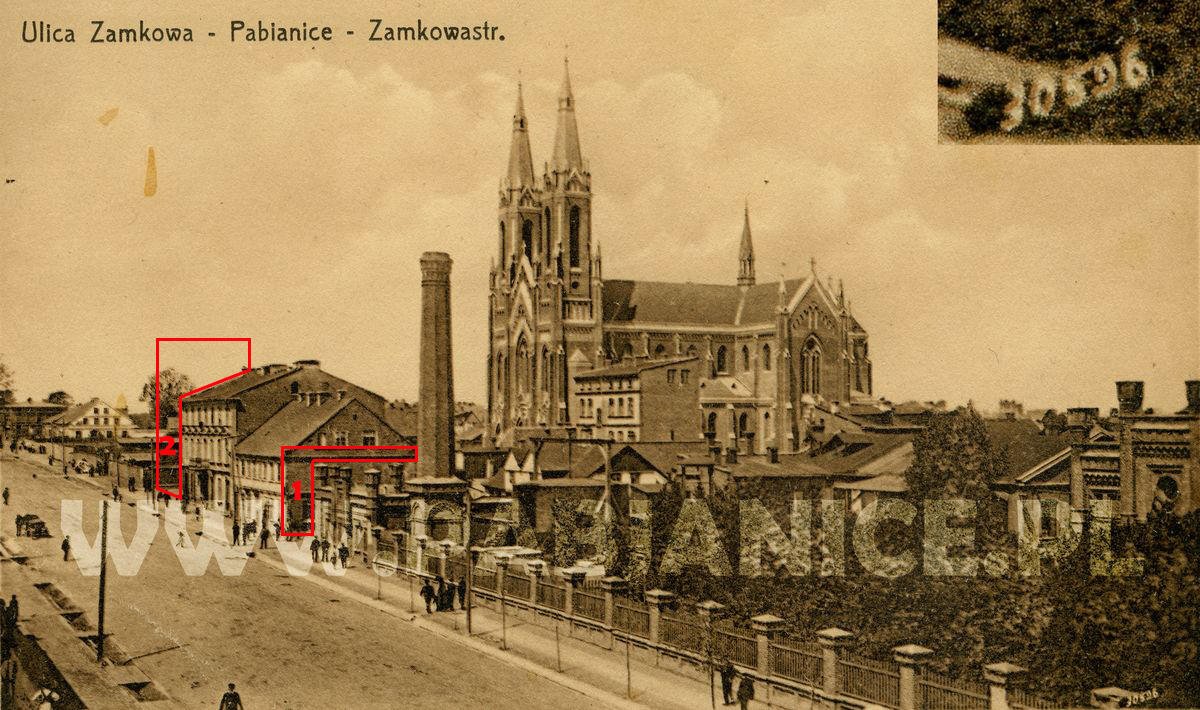 Jakkolwiek, szukając informacji w zbliżonym okresie, często sięgam do pięknego i nader obfitego źródła wiedzy, jakim jest plan miasta z 1908, na którym tej kamienicy jeszcze nie ma, choć z logicznego wniosku wychodzi, że powinna być. Trzeba tu jednak pamiętać, że wyrysowanie tak szczegółowego planu dość już wówczas dużego miasta fabrycznego musiało zająć sporo czasu i nie dało się jej „zaktualizować” przed drukiem. A przynajmniej ten element nie został już naniesiony, mimo około rocznej przerwy od wybudowania do wydania planu miasta. Zaznaczyłem ją numerem dwa, gdyż jest niejako drugim obiektem, którego nie widać na zdjęciu.