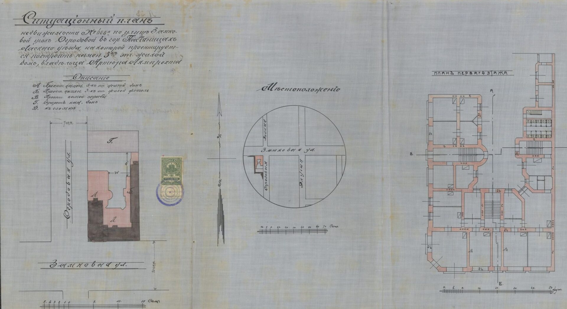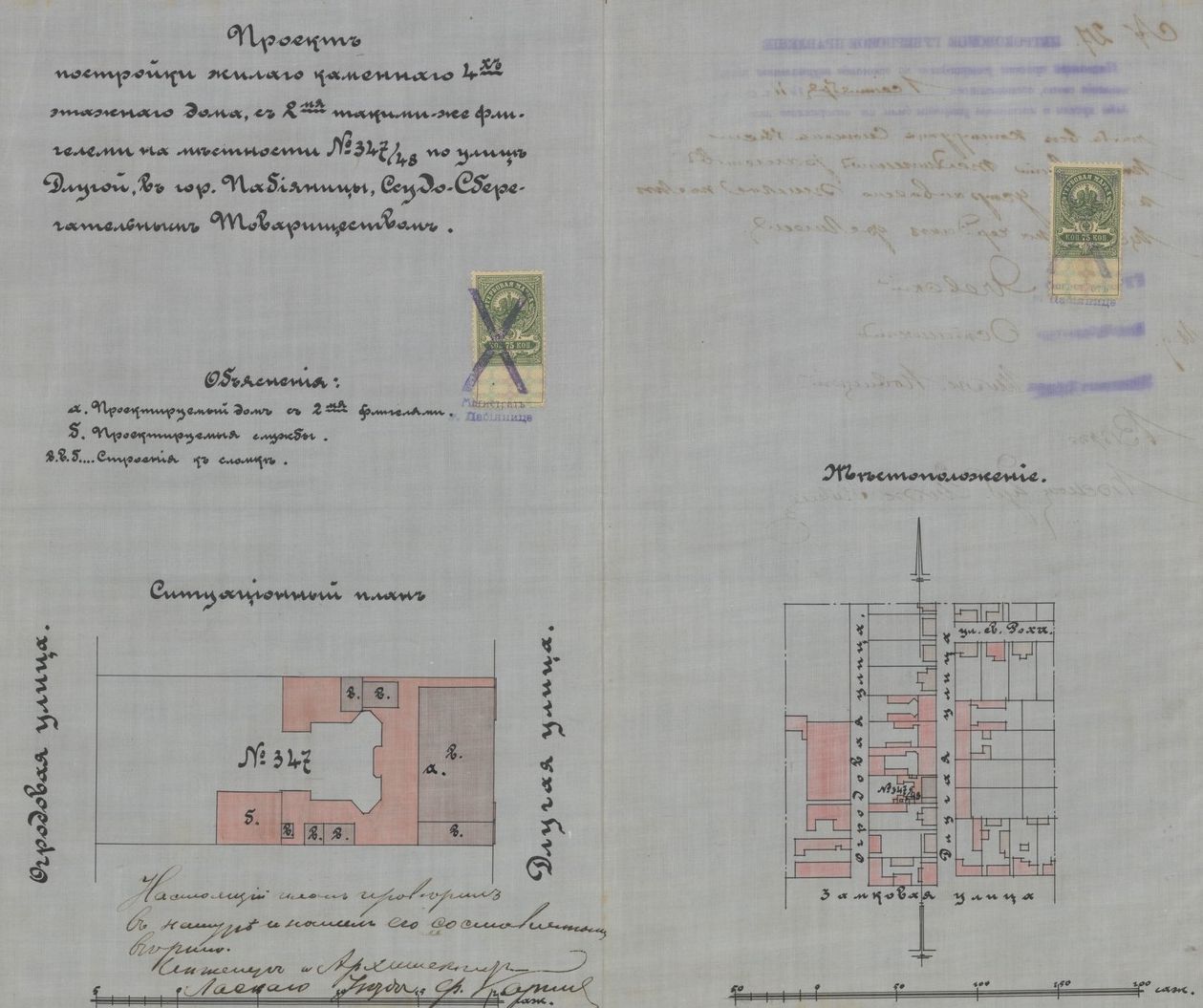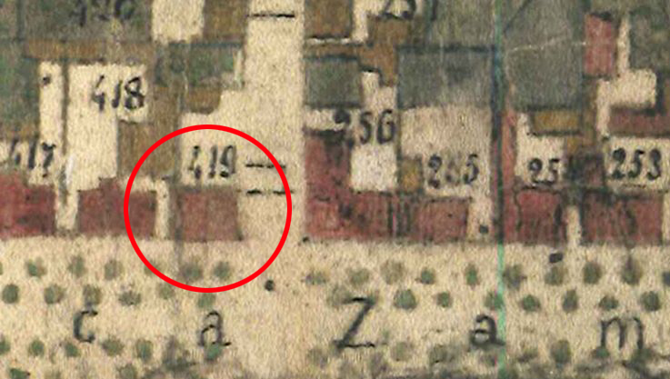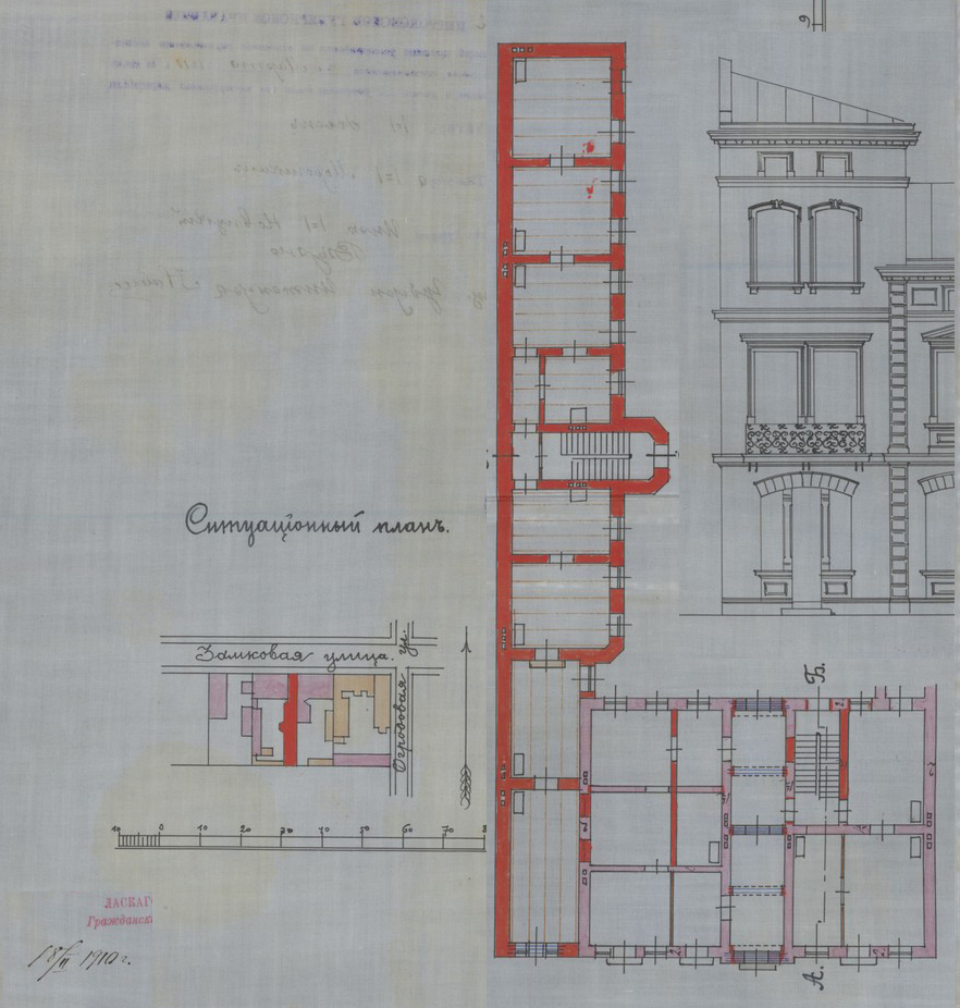 Trzecim elementem,  który zauważyłem to plomba, którą mamy dziś widoczną pod adresem Zamkowej 24, również której dokumentacja została wydana w 1910 roku. Plan ów pokroiłem i skleiłem dla uproszczenia widoku, w oryginale jest o wiele bardziej szczegółowy a przez co rozwlekły. Dodałem też z drugiego końca datę w rogu. 18 lutego 1910 roku.