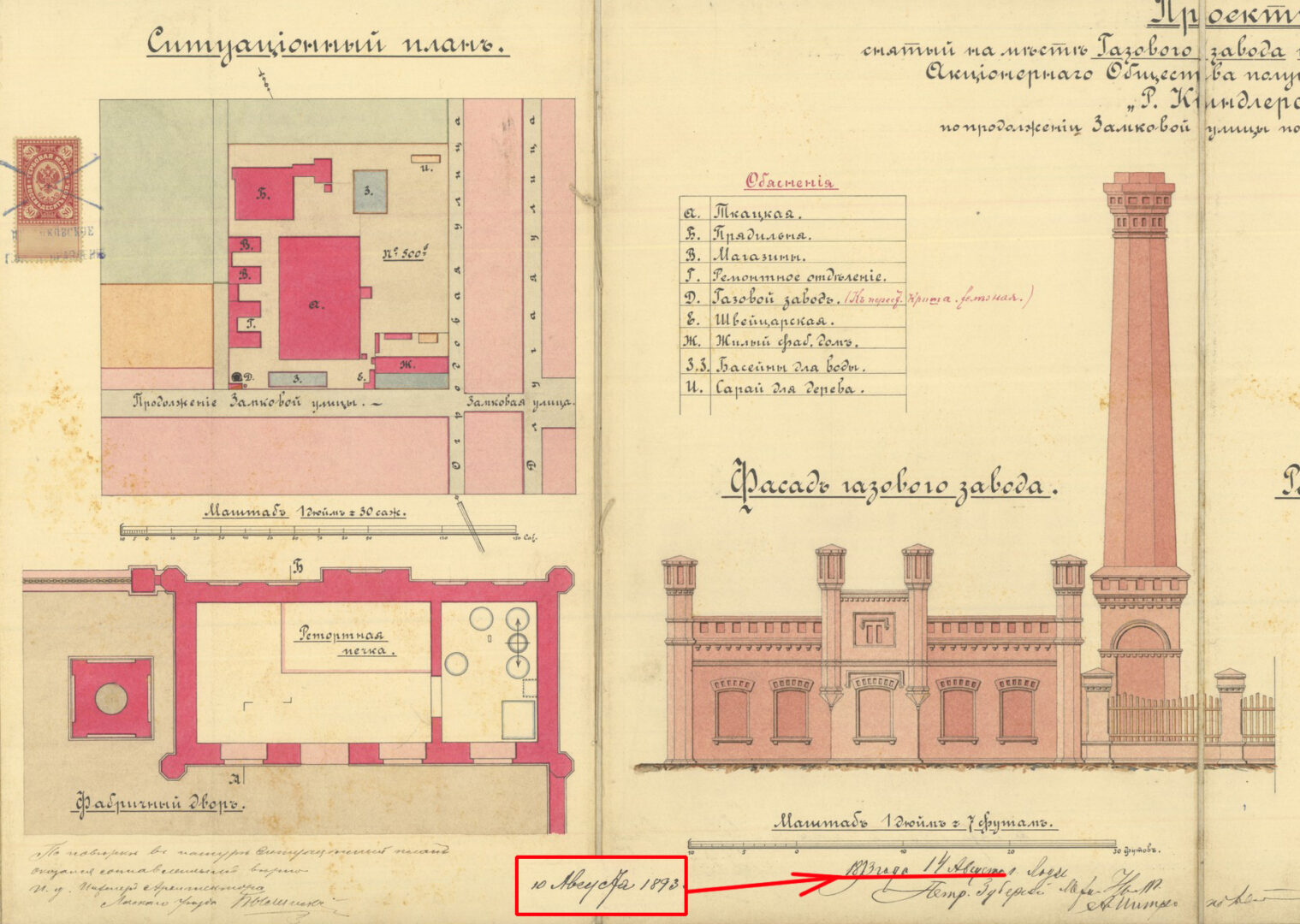 Plan budowy komina, który stał w południowo-zachodnim rogu zakładów, widać go na rysunku sytuacyjnym jako czarną kropkę. Mamy tu też dwie daty odległe od siebie raptem o 4 dni, 10 i 14 sierpnia 1893 roku. Zatem znalazłem dolną granicę, gdyż tu ów komin jest już wybudowany, czyli fotografia nie może być starsza niż 1894 rok – zakładając, że nie wybudowali go przed końcem 1893 roku a widząc bujność roślinności obstawiam co najmniej późnowiosenną porę, może nawet letnią.