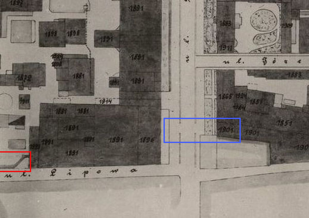 Ano, pierwsze to oczywiste: główny bohater w postaci kościoła. Co jeszcze… ano… kaplicę pogrzebową. Gdyby nie fotografia, byłaby tylko kwadracikiem na jednym planie miasta z 1878 i to też w sumie byłoby kłamstwem, gdyż rozebrano ją dwa lata wcześniej. Zatem gdyby więc plan był aktualnym do bólu, nie została by na niego naniesiona lub usunięta jeszcze przed drukiem!